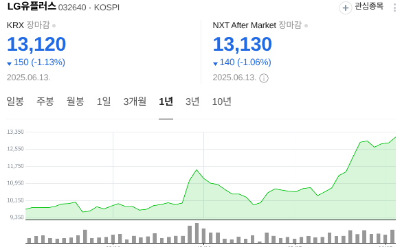 - 2024년 말 1억 원을 LG유플러스에 투자했다면, 2025년 6월 현재 주가가 약 24~26% 상승해 약 2,400만~2,600만 원의 평가차익이 발생합니다.