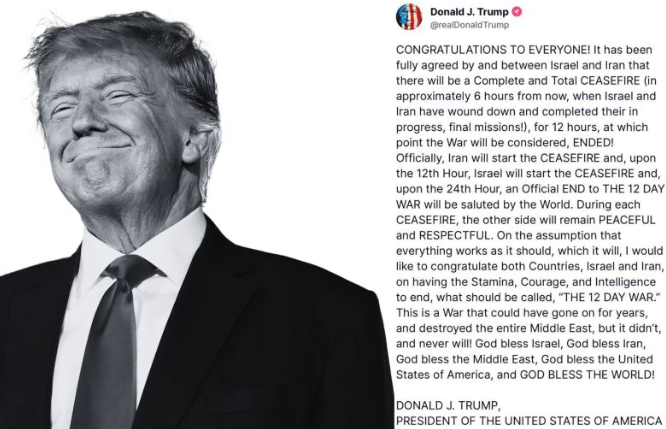 이스라엘과 이란이 오랜 갈등 끝에 완전한 휴전에 합의하였습니다. 이번 휴전은 도널드 트럼프 미국 대통령과 카타르 국왕의 적극적인 중재로 성사되었습니다. 이란이 먼저 휴전을 선언하고, 12시간 뒤 이스라엘이 이에 동참하는 방식으로 단계적으로 진행되었으며, 24시간이 지난 후 전쟁이 공식적으로 종료되었습니다. 트럼프 대통령은 이번 휴전이 “영원히 지속될 것”이라고 강조하였고, 카타르 국왕 역시 중동 지역의 평화와 안정을 위한 중요한 전환점임을 언급하였습니다.