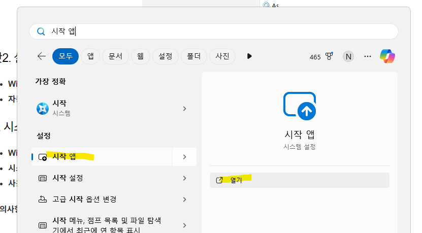 닷2. 설정 앱을 이용한 윈도우 시작프로그램 설정 방법