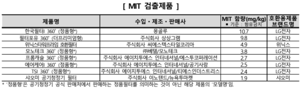 공기청정기 호환필터 8종에서 유해물질 MIT 검출